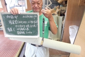 当店では、よく使用する部屋、子供部屋等には国産の麻引綿W表(畳表重量2.1Kg~2.3Kg)の生産者名のはいっている畳表をおすすめしています。あまり使用しない座敷間等について、糸が2本の綿Wの中国の眉山表をおすすめしています。畳表を何種類か持ってきてもらって比較するとその違いがわかります。